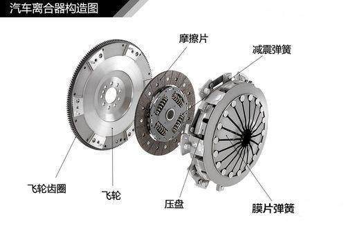 我們能看到離合器的位置就是在發(fā)動機和變速器這兩者之間的,簡單的說就是離合器的一端是連著發(fā)動機的,另外一端是連著變速器的。它的組成部分分為:主動部分(飛輪、離合器蓋等)、從動部分(摩擦片)、壓緊機構(gòu)(膜片彈簧)和操縱機構(gòu)(離合器踏板)。如圖